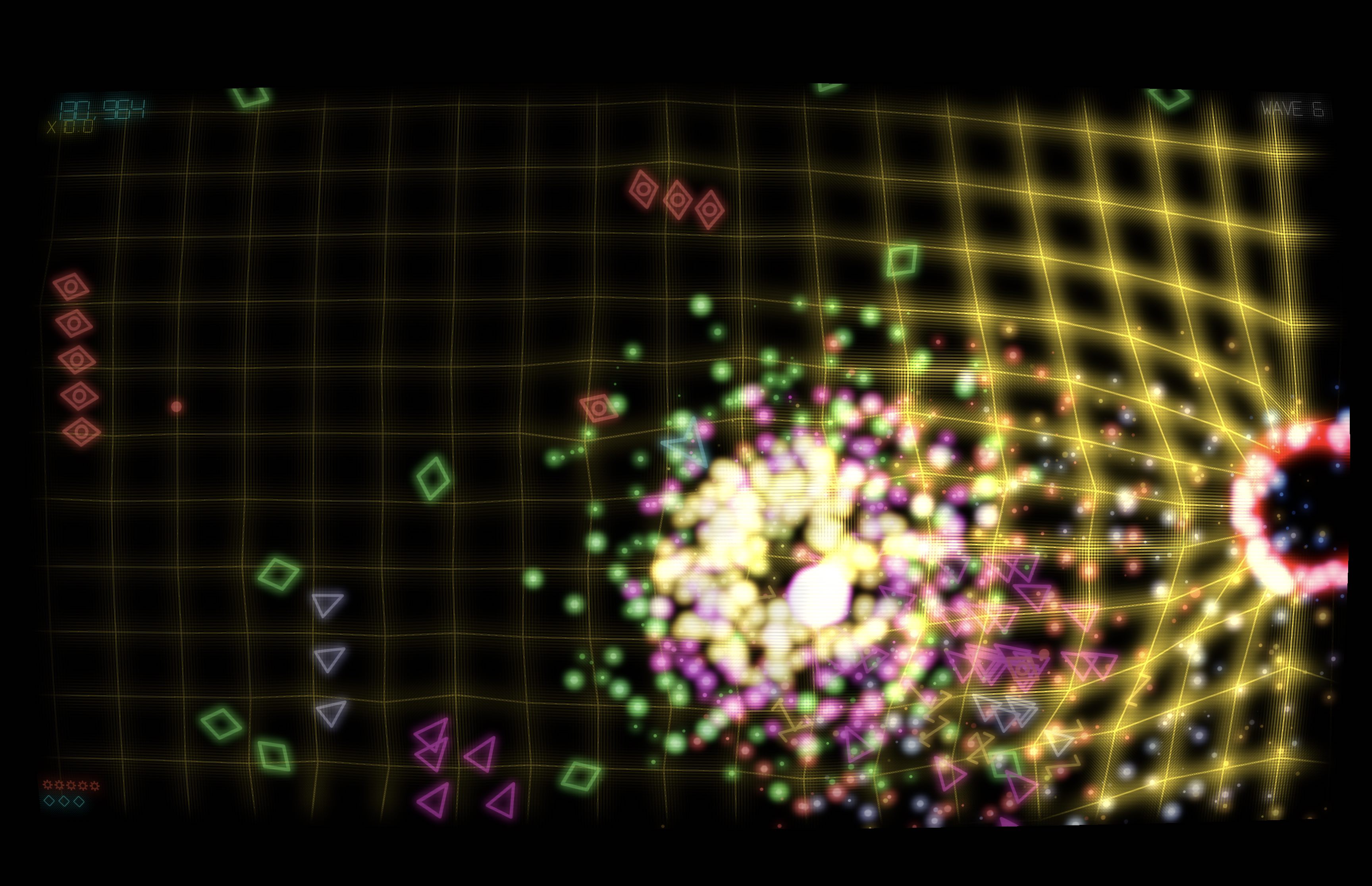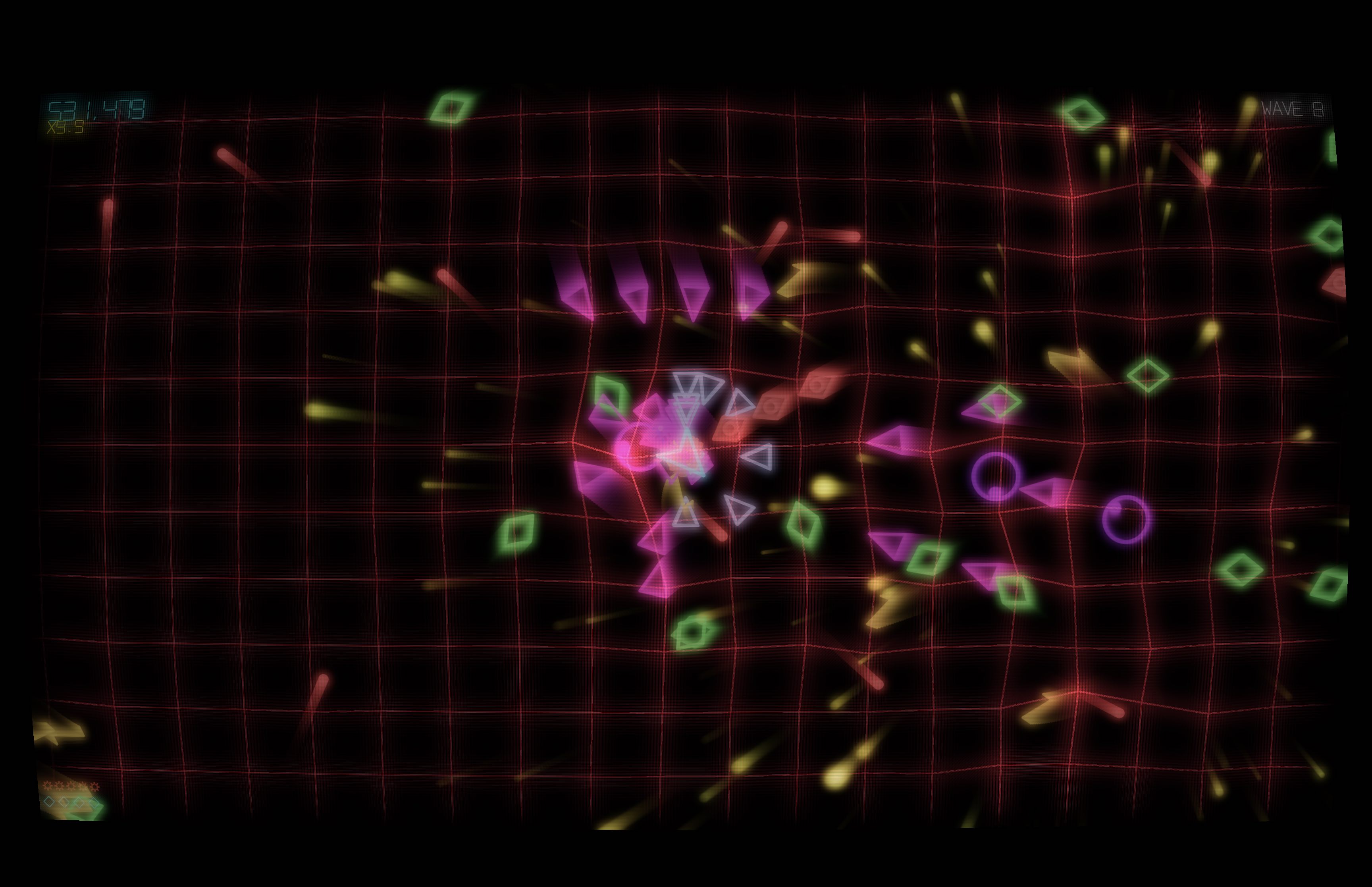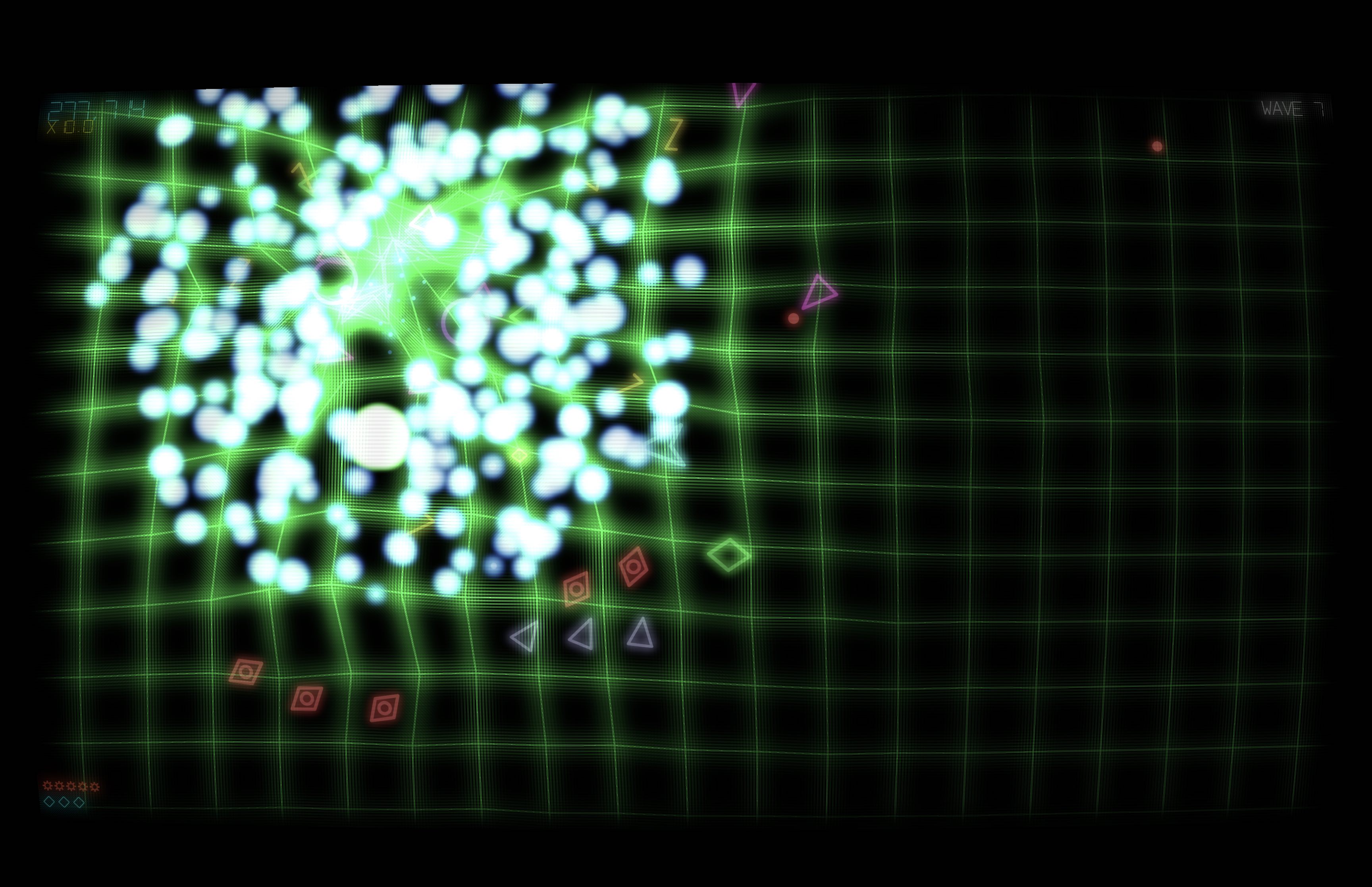 From the start I’d set off wanting to lean into an almost psychedelic vibe and as I worked on the game I ramped this up, dialled it back in areas, ramped it up again trying to pitch things just on the right side of comprehendible. Mostly I dialled it up! There was a lot of tweaking of bloom, of the fairly subtle CRT effect, and the phosphor trails. Then tinkering with particles - volume, speed, etc. WebGPU really helped with this - the particles running on the GPU leaves loads of room on the CPU for a high entity count and collisions etc.